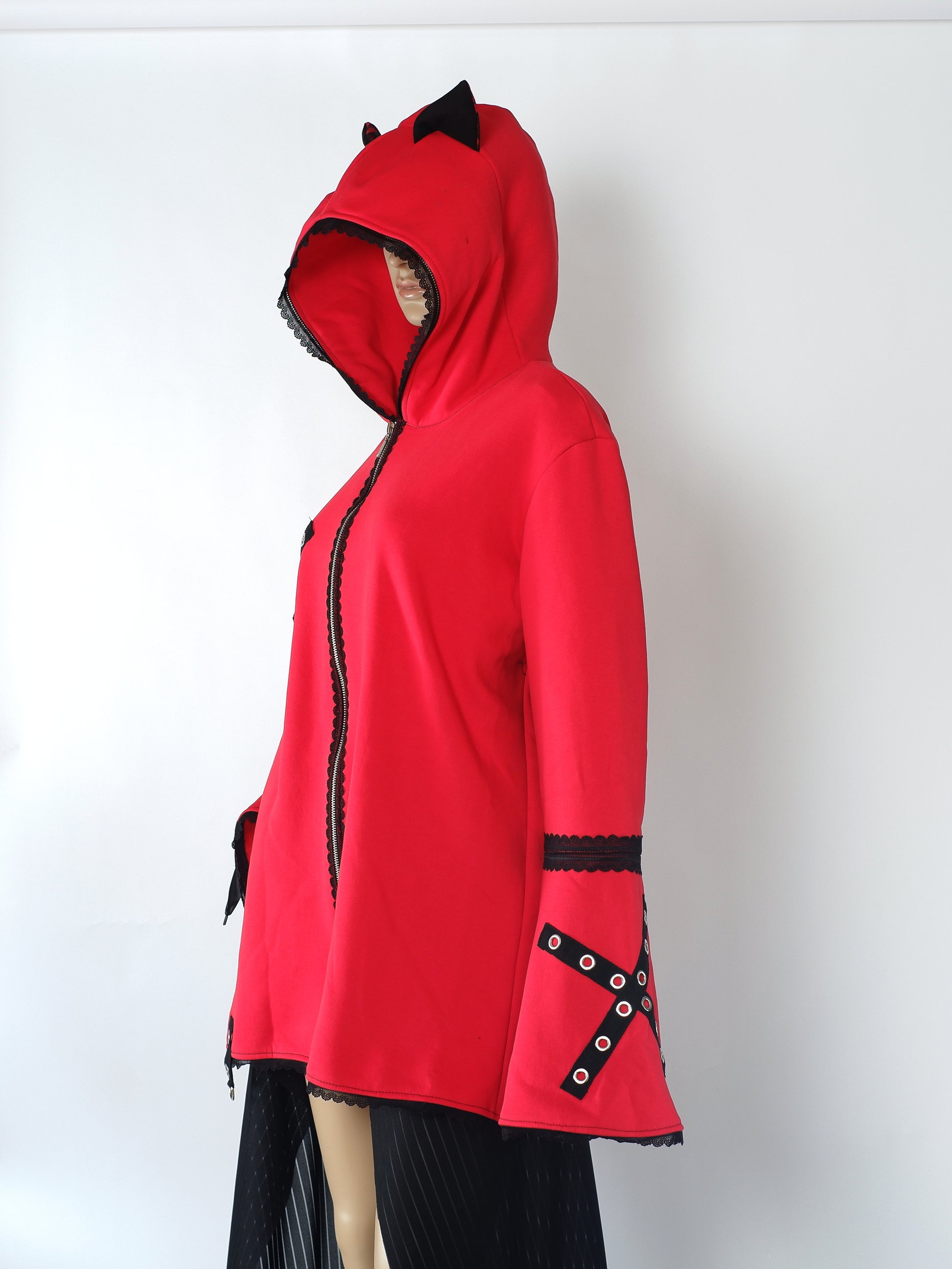 Kapuze: Übergroße Kapuze mit schwarzen Katzenöhrchen, gesäumt von einer feinen, schwarzen Spitzenborte.