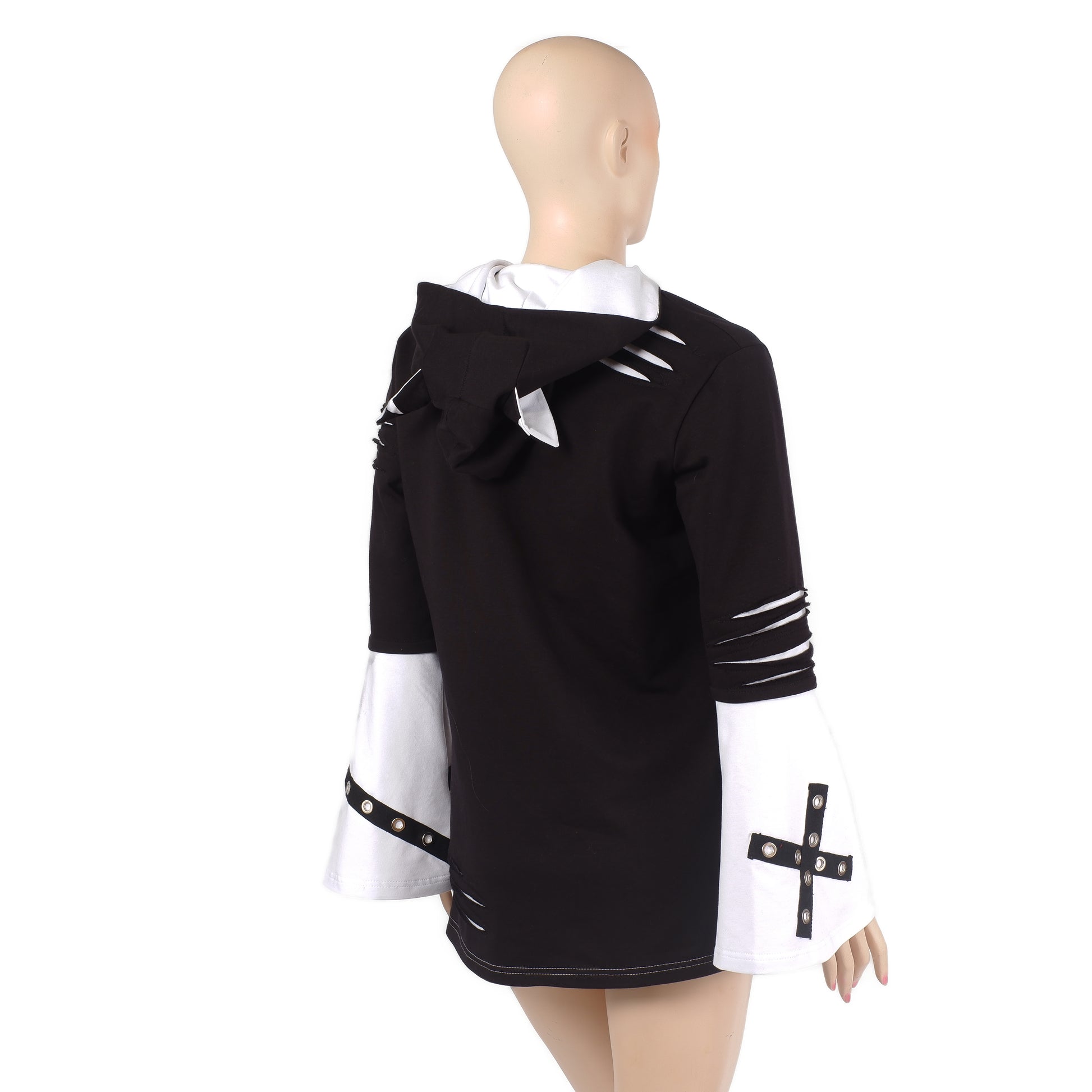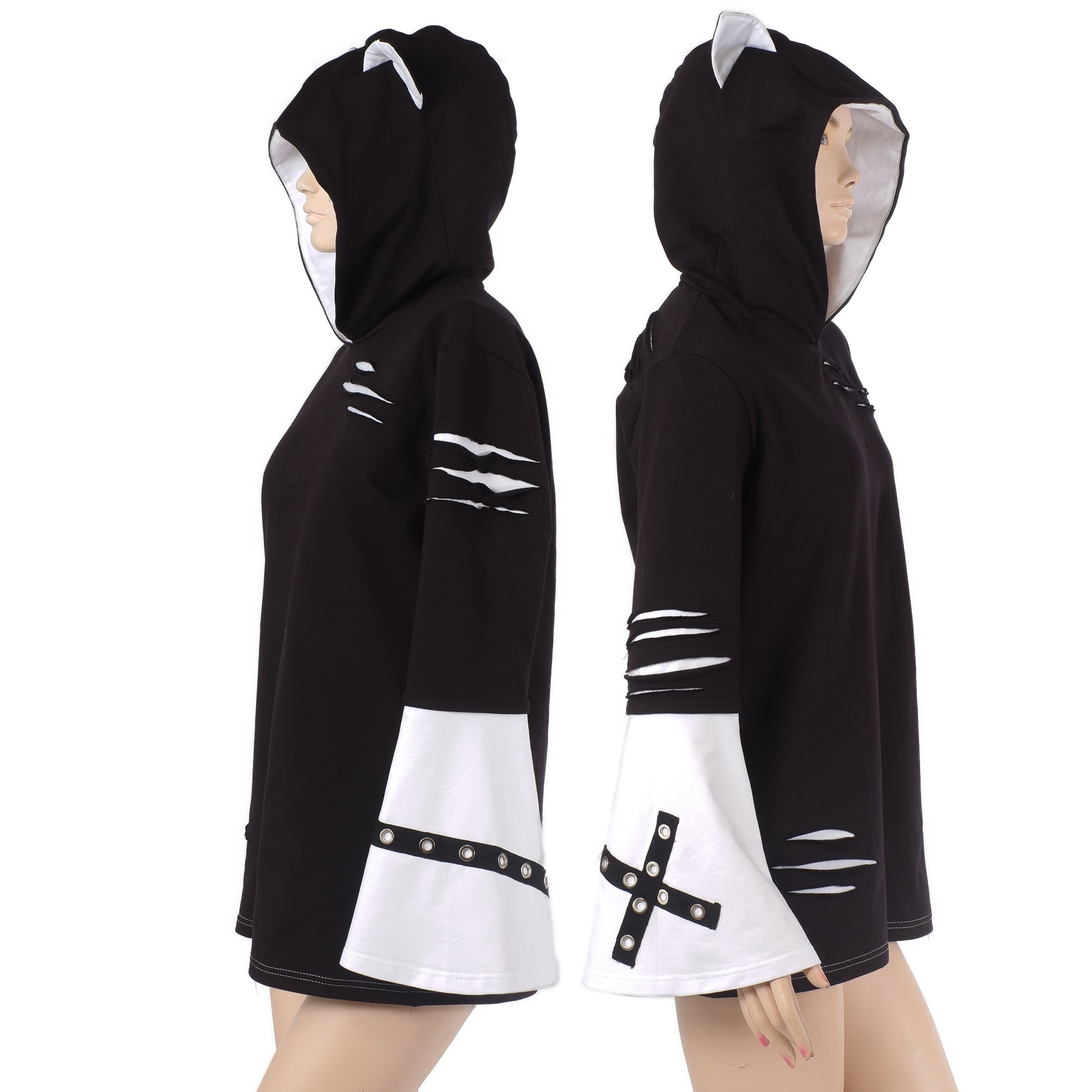Dieser handgefertigte Hoodie spielt mit dem zeitlosen Schwarz-Weiß-Kontrast und einem aggressiven Destroyed-Look. Ein auffälliges Statement-Piece für alle, die einen düsteren, aber klaren Style bevorzugen.