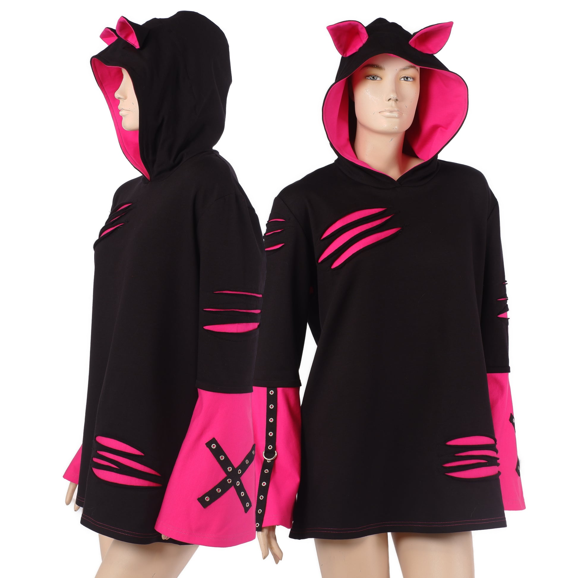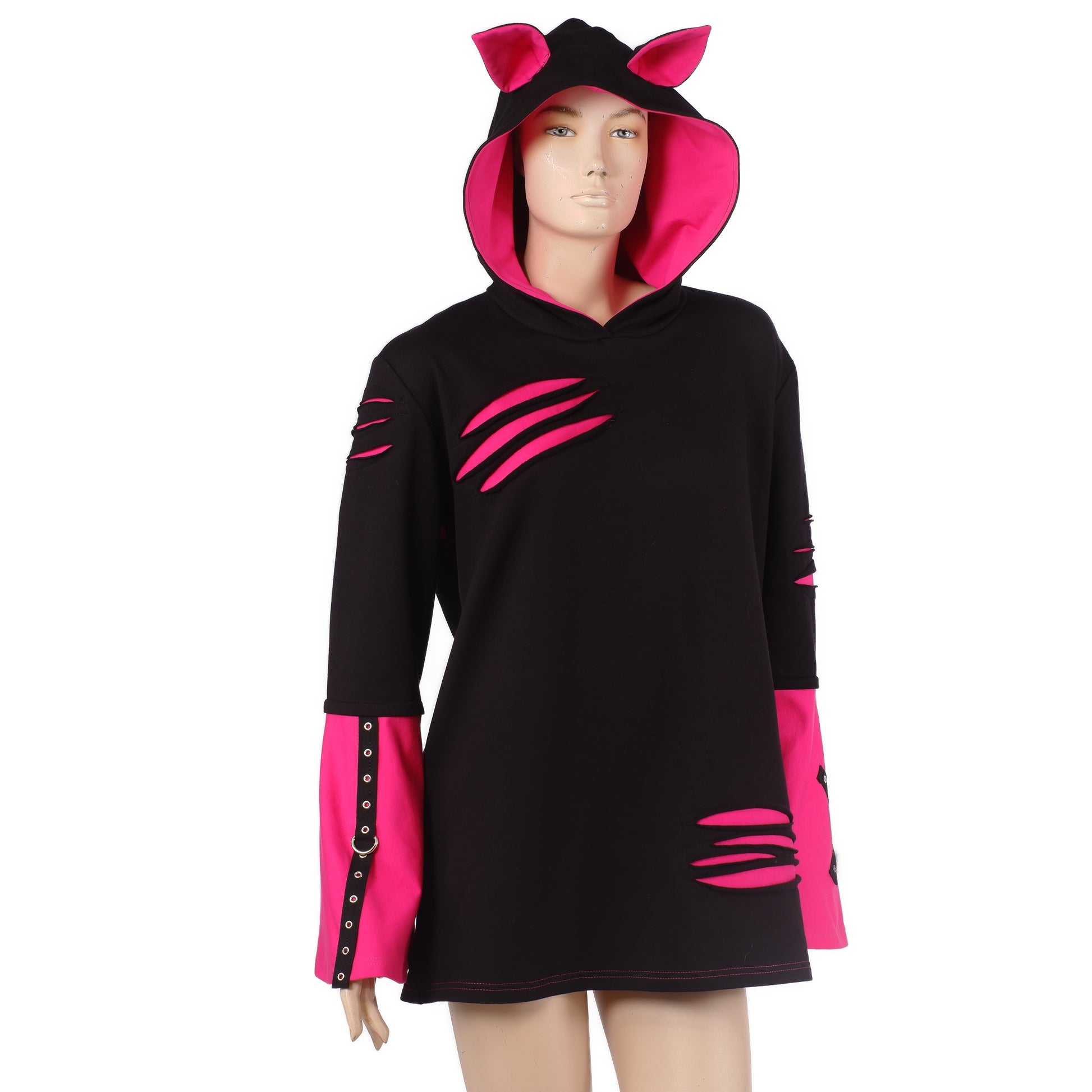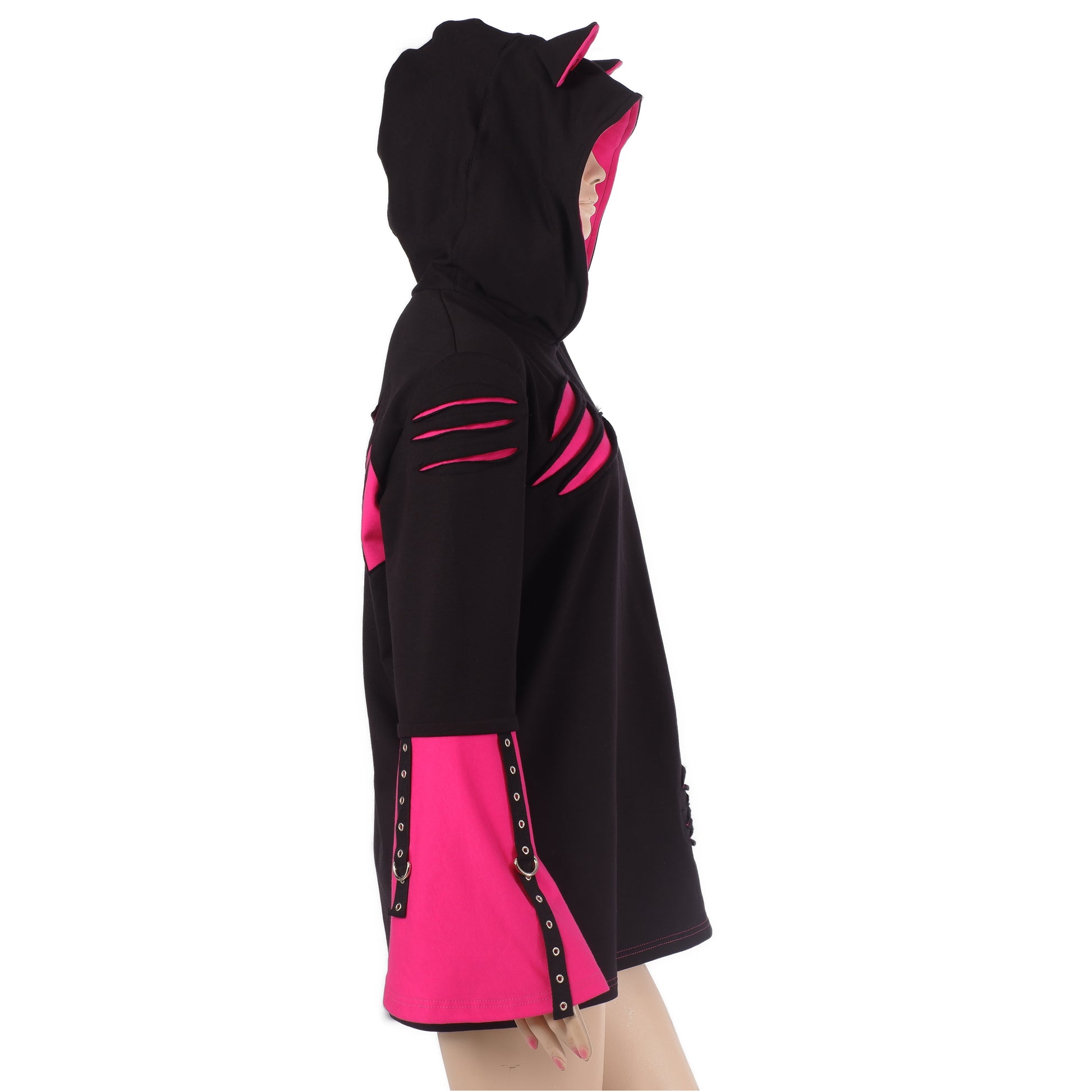 - Kapuze mit Ohren: Die Kapuze ist mit kleinen, spitzen Fledermausohren versehen und innen in leuchtendem Neon-Pink gefüttert
